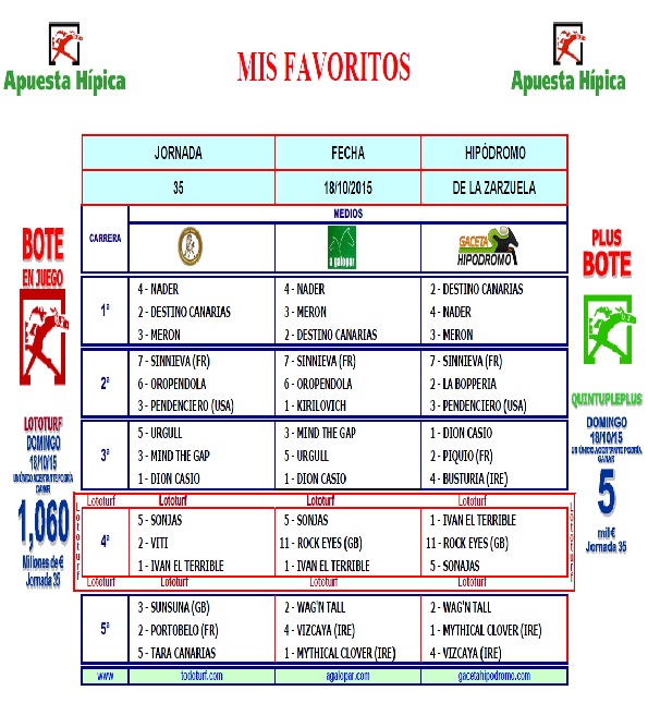 Una sorpresa: Estaremos muy atentos al debut de MELIBEA en la cuarta carrera, una hija de la rentable DIRCE, yegua que todavía no ha dado nada interesante en la cría, pero que en cualquier momento (y podría ser MELIBEA) se destaca en la cría. El cruce es interesante con un semental que suele dar distancia como Yeats, no en vano la debutan a dos curvas. La principal incógnita sobre ella es que el Duque no suele apretar mucho en el debut, de hecho no la a matriculado para ningún gran premio, pero eso para su debut puede ser positivo, ya que no le han marcado ningún objetivo claro, más que el rentabilizar en la medida de lo posible la temporada de Otoño, además, debutarla a mediados de octubre de sus tres años le ha dado tiempo suficiente a la preparación para sacarla a punto, si bien no para ganar si por lo menos para las colocaciones y el trio se encarecería. A dos días de la carrera cotiza a más de 14 €